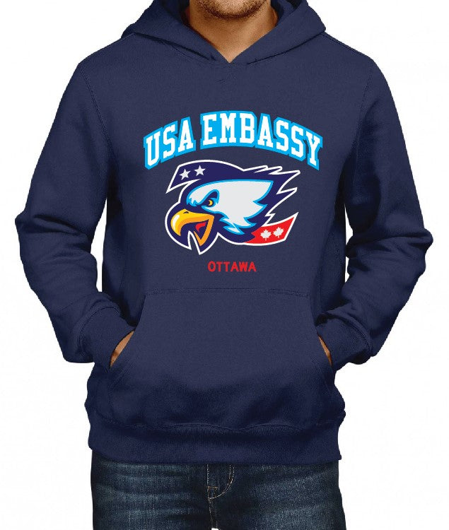 The Official hoodie for the US Embassy personnel. Branded for Toronto, Montreal, Ottawa, Calgary or Vancouver offices .Embroidered Logo with stitched lettering and felt logo.